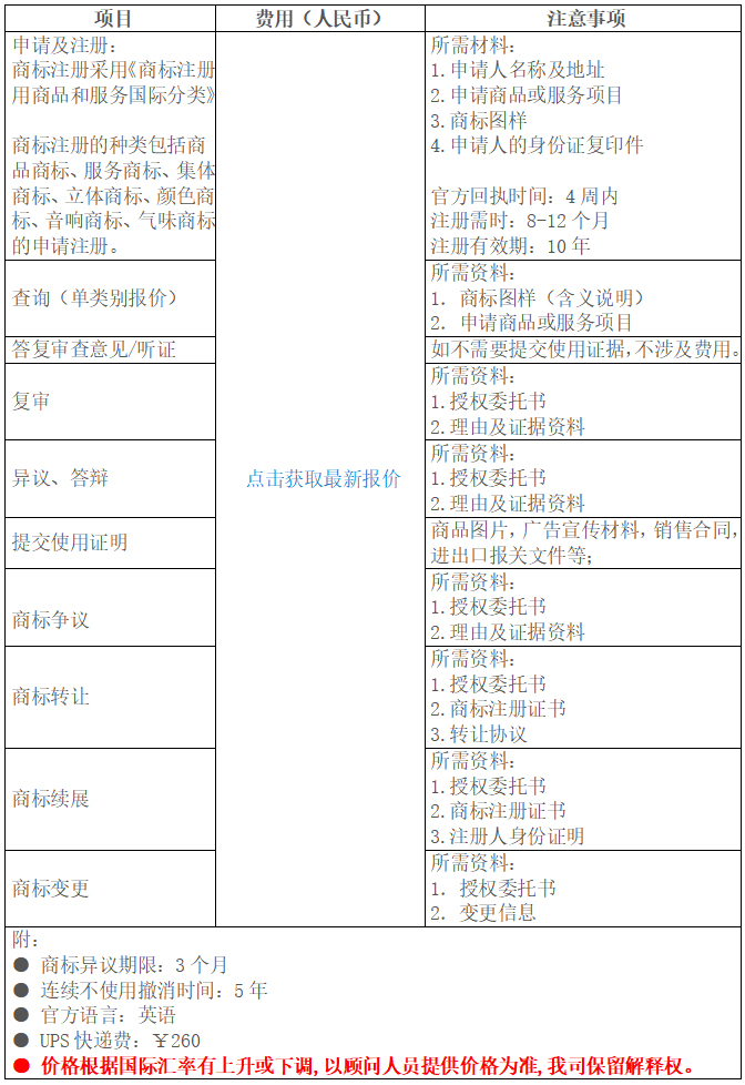 答:欧盟商标注册涉及官费及代理费,请联系我司国际商标注册顾问专员;费用包括申请官费,本公司代理费以及文件往来的邮递费,不包括税项、不包括商标申请出现意外的情形处理费(例如商标答辩、商标复审、提交商标使用证明等)。